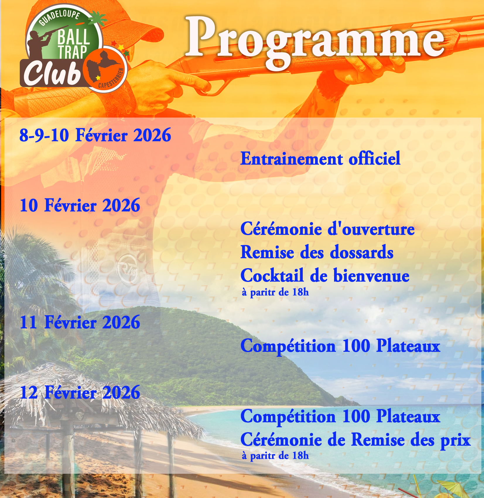 Coupe des Caraïbes 2026 (400 plateaux) Basée sur le cumul des scores du Grand Prix de Guadeloupe de Parcours de Chasse et du Grand Prix de Guadeloupe de Compak Sporting. |